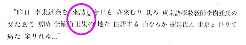 “昨日 李秉逵赤 を 來訪し 今日も 赤來むり 氏ろ 東京語學敎敎師氏の 父たゑて