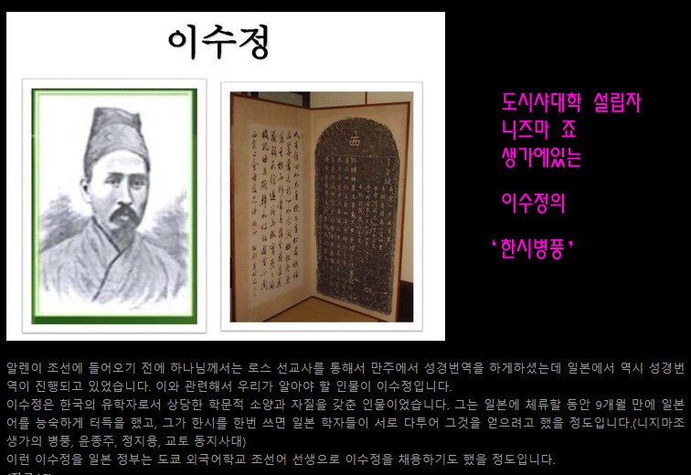 역사학자이며 장신대 교수를 지낸 김수진 목사가 지난달초 한국 기독교사에 지대한 업적을 남긴 이수정(李樹廷 1882∼1886)의 독실한 신앙을 엿볼 수 있는 한시 병풍을 일본 교토 도시샤대학 창설자 니지마 조 생가에서 발견,최근 공개했다. 김수진 목사의 기고를 통해 이수정의 신앙과 삶을 재조명해 본다.