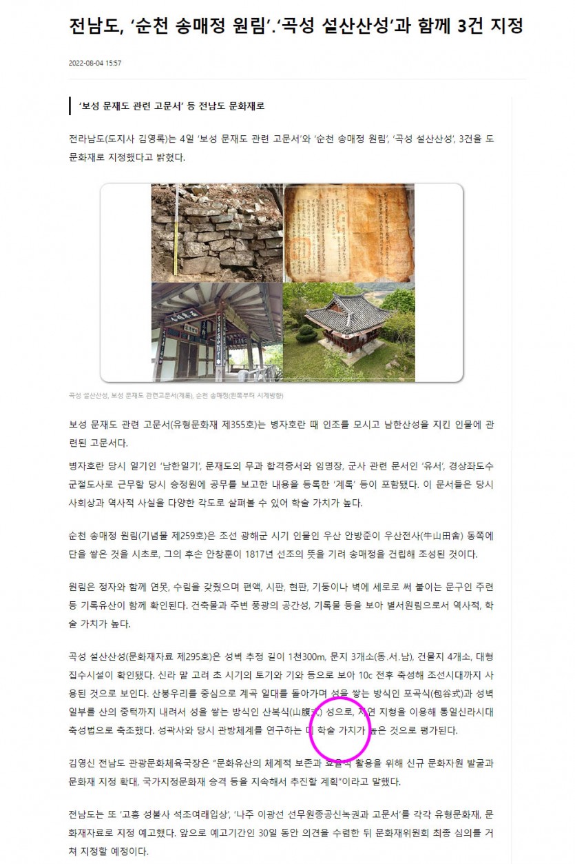 옥과 설산 '전남문화재로' 지정( 성결=정직 )
