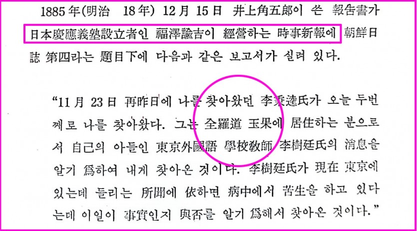 이에 대한 근거는 1884年 11月 이수정(李樹廷)은