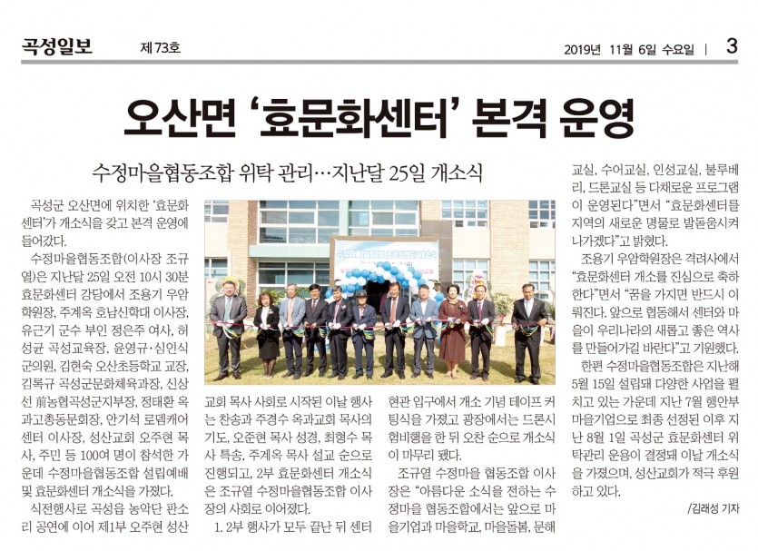 수정마을 '효문화센터' 본격 운영 페이지 정보 작성자 최고관리자 작성일19-11-07 14:16 조회1,703회 댓글0건 관련링크 이전글 다음글 목록 답변 글쓰기 본문 곡성일보 2019년 11월 6일자 기사에서 지난 10월 25일 효문화센터에서 열린 수정마을협동조합 설립예배 및 효문화센터 개소식 행사 관련 보도를 하였습니다. SNS공유 댓글목록 등록된 댓글이 없습니다. 이전글 다음글 목록 답변 글쓰기