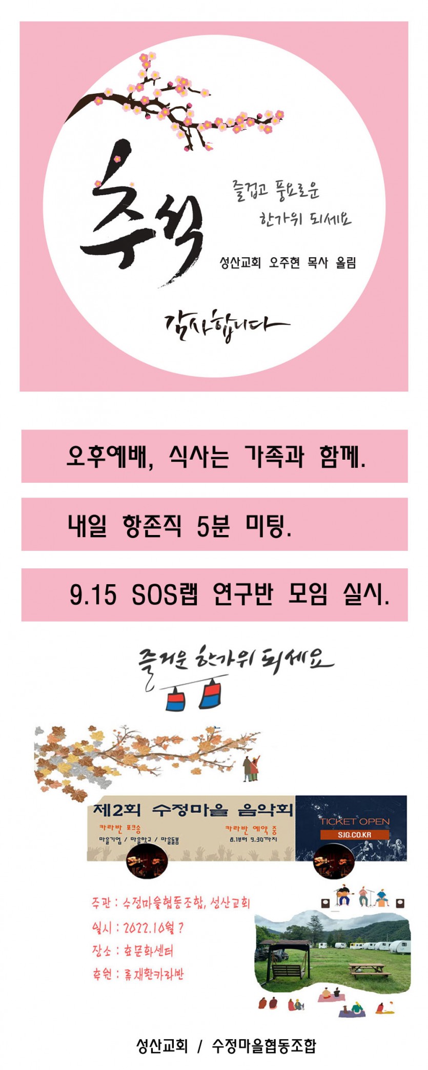 가족( 엄마의 품, 추석) 페이지 정보 작성자 최고관리자 작성일22-09-10 18:09 조회1,202회 댓글0건 관련링크 이전글 다음글 목록 글쓰기 본문 SNS공유 댓글목록 등록된 댓글이 없습니다. 이전글 다음글 목록 글쓰기