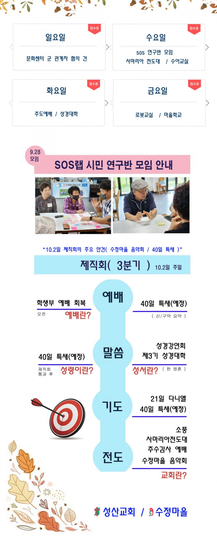 9.25일 예배안내 페이지 정보 작성자 최고관리자 작성일22-09-24 18:02 조회1,058회 댓글0건 관련링크 이전글 다음글 목록 글쓰기 본문 주님 이름으로 문안합니다. 다니엘 21 기도 후 시행 되는 모든 일들이 아름답게 결실 맺기를 기도합니다. 특히, 제직회 결의 따라 수정음악회. 40특새. 추수감사. 정책회의. 송구영신. 은혜롭게 열매 맺기를 소망합니다. 감사합니다. 오주현 목사 드림. SNS공유 댓글목록 등록된 댓글이 없습니다. 이전글 다음글 목록 글쓰기