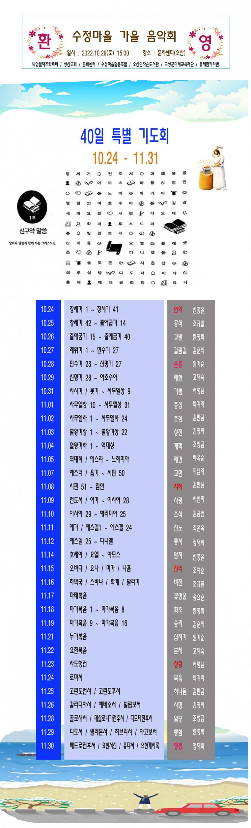 '40' 특별 기도회 2022-2023 페이지 정보 작성자 최고관리자 작성일22-10-03 21:30 조회1,159회 댓글0건 관련링크 이전글 다음글 목록 글쓰기 본문 2022-2023 40 특별 기도회. 날마다 샘솟는 생수를 마시는 기도회 되시길 소망합니다. 오주현 목사 드림. SNS공유 댓글목록 등록된 댓글이 없습니다. 이전글 다음글 목록 글쓰기