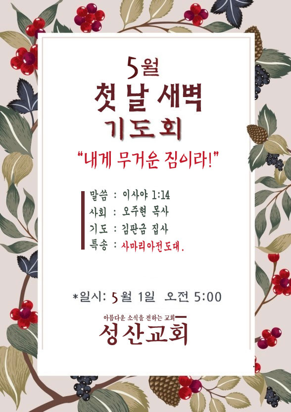 공지 | 5월 첫 날 페이지 정보 작성자 최고관리자 작성일26-04-27 06:35 조회17회 댓글0건 관련링크 다음글 목록 글쓰기 본문 * SNS공유 댓글목록 등록된 댓글이 없습니다. 다음글 목록 글쓰기