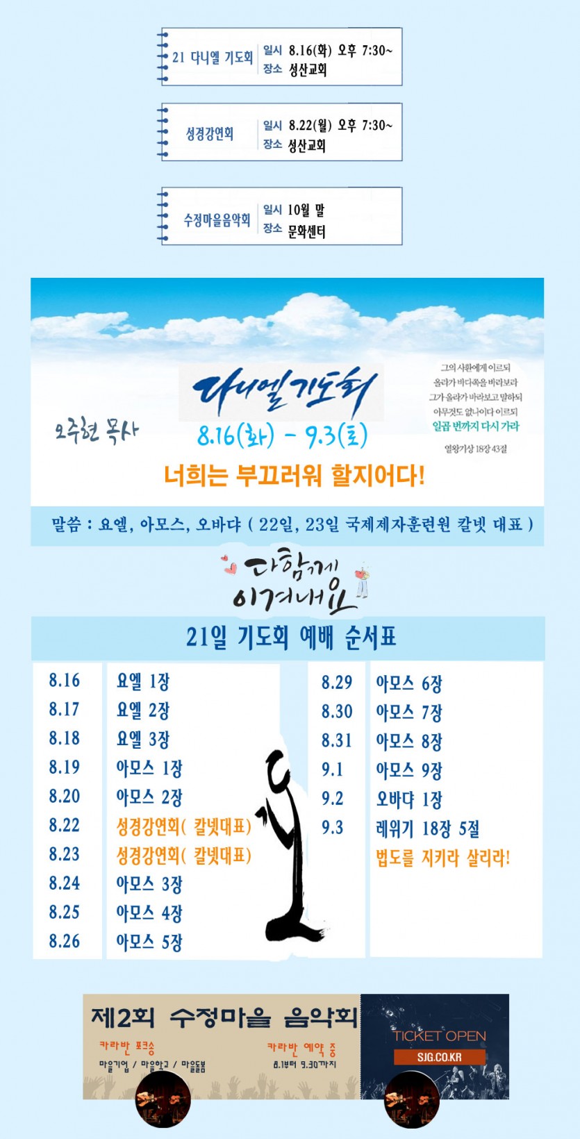 7.30 예배안내 페이지 정보 작성자 최고관리자 작성일22-07-30 17:33 조회1,143회 댓글0건 관련링크 이전글 다음글 목록 글쓰기 본문 이제 다시! 시작할 때입니다. 기도로 새로운 지평을 새판으로 다시 짜서, 코로나 이후 새롭게 만들어가 가시기를 기도합니다. SNS공유 댓글목록 등록된 댓글이 없습니다. 이전글 다음글 목록 글쓰기
