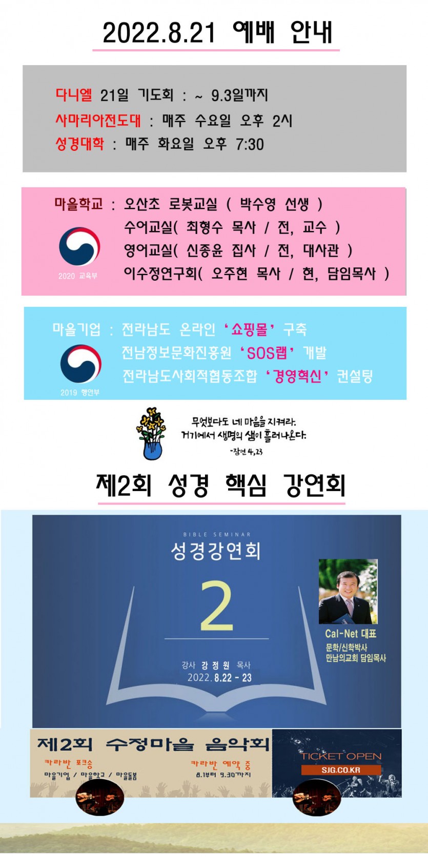 8.21일 예배 안내 페이지 정보 작성자 최고관리자 작성일22-08-20 17:59 조회1,065회 댓글0건 관련링크 이전글 다음글 목록 글쓰기 본문 오는 8.21일부터 8.23일까지 성경강연회가 오후 7시부터 성산교회에서 개최됩니다. 많이 참석하셔서 은혜의 시간이 되시기를 소망합니다. SNS공유 댓글목록 등록된 댓글이 없습니다. 이전글 다음글 목록 글쓰기