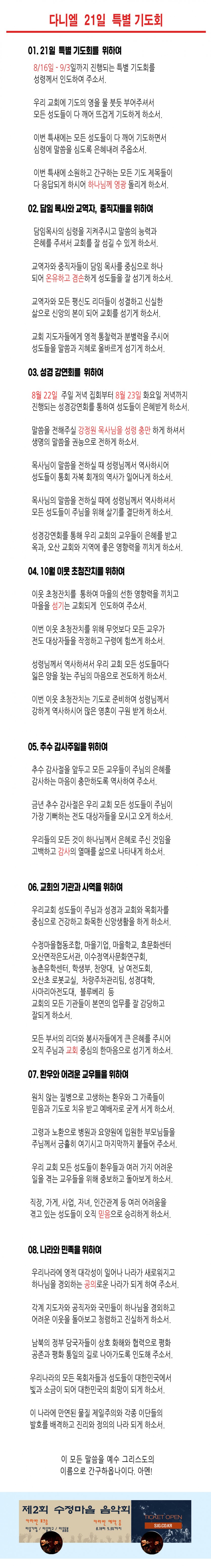 그러므로( 다니엘 12일차 ) 페이지 정보 작성자 최고관리자 작성일22-08-29 17:56 조회1,143회 댓글0건 관련링크 이전글 다음글 목록 글쓰기 본문 오늘 밤은 다니엘 12일차 기도회입니다. 우리의 뿔이 아닌, 하나님의 구원의 뿔이 인도하기를 소망합니다. 쓴 쑥을 공의의 열매로 바꾸기를 기도합니다. 꼭! 뵙겠습니다. 오주현 목사 드림. SNS공유 댓글목록 등록된 댓글이 없습니다. 이전글 다음글 목록 글쓰기