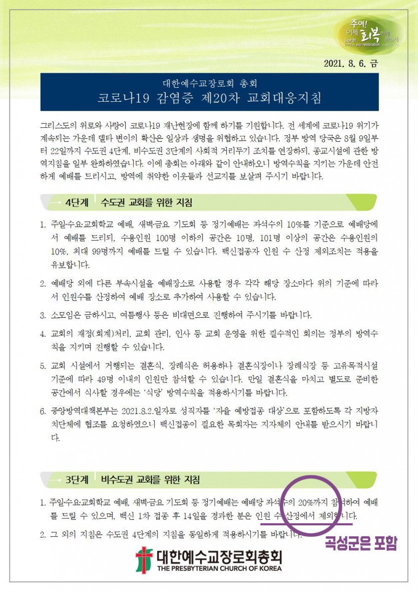 붙임 : 대한예수교장로회 총회의 코로나19 감염증 제20차 교회대응지침(2021.8.6.). 끝