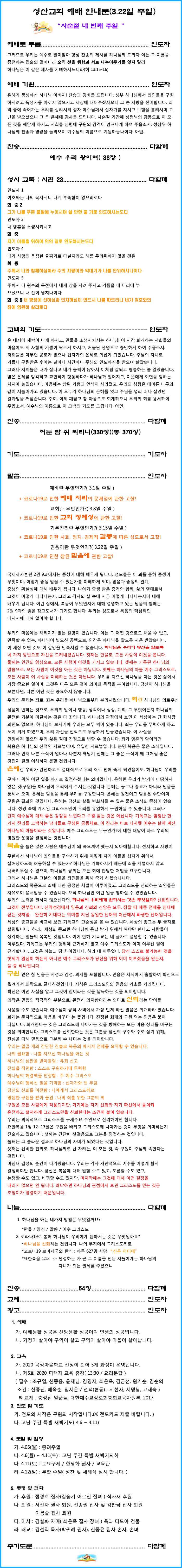 3.22 예배문 안내 페이지 정보 작성자 최고관리자 작성일20-03-22 07:55 조회1,740회 댓글0건 관련링크 이전글 다음글 목록 글쓰기 본문 . SNS공유 댓글목록 등록된 댓글이 없습니다. 이전글 다음글 목록 글쓰기