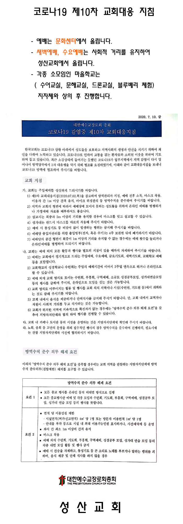 붙임 : 대한예수교장로회 총회의 코로나 19 감염증 제10차 교회대응지침(2020. 7. 10.) 끝.