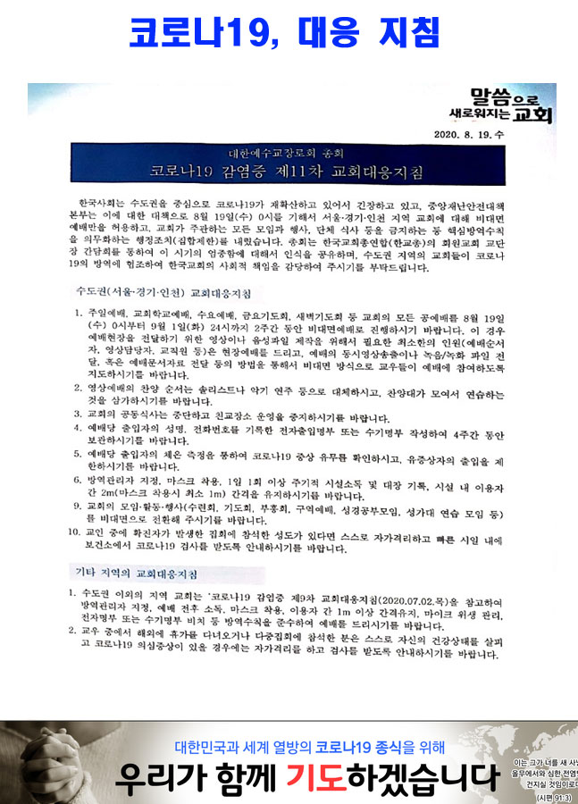 붙임 : 대한예수교장로회 총회의 코로나19 감염증 제11차 교회대응지침(2020. 8. 19.) 끝.