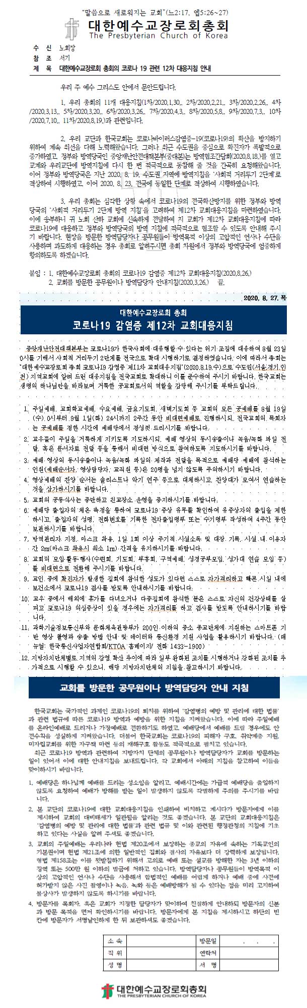 코로나19관련 대한예수교장로회 제12차 대응지참과 관련하여