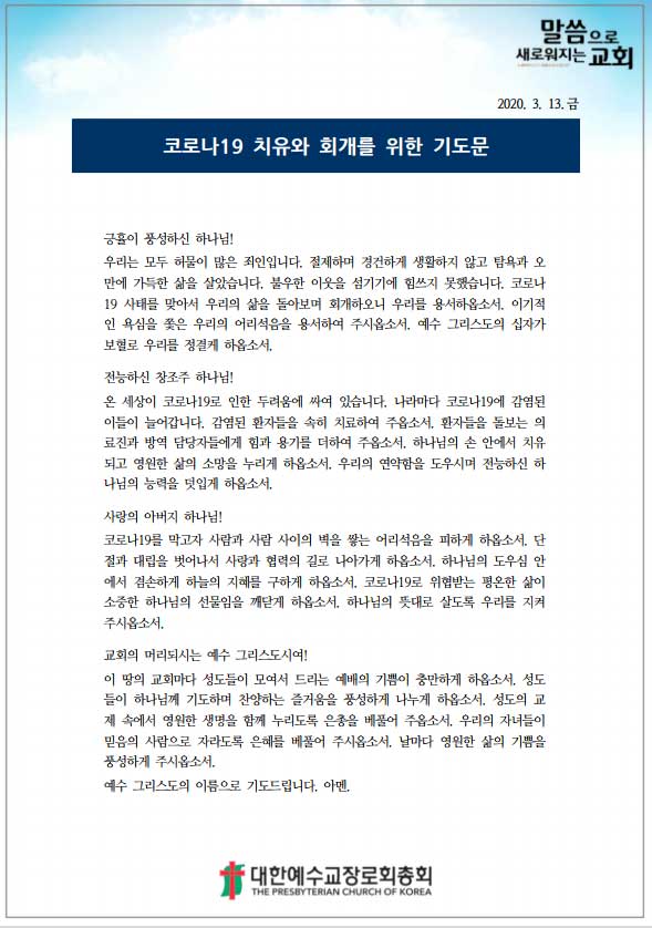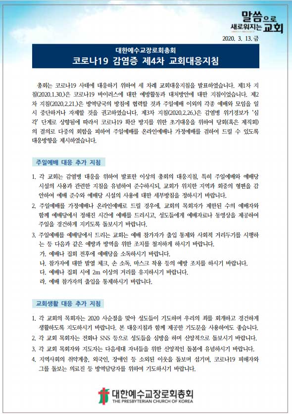 붙임 : 대한예수교장로회 총회의 코로나 19 감염증 제4차 교회대응지침(2020.03.13.) 끝.