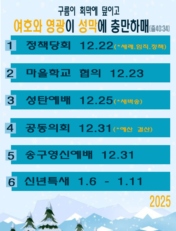 공지 | 정책당회 2025 페이지 정보 작성자 최고관리자 작성일24-12-16 19:15 조회945회 댓글0건 관련링크 이전글 다음글 목록 글쓰기 본문 *40일 특별새벽 기도회 수고 많으셨습니다. *하나님의 은혜가 임하시기를 기대합니다. 2025. SNS공유 댓글목록 등록된 댓글이 없습니다. 이전글 다음글 목록 글쓰기