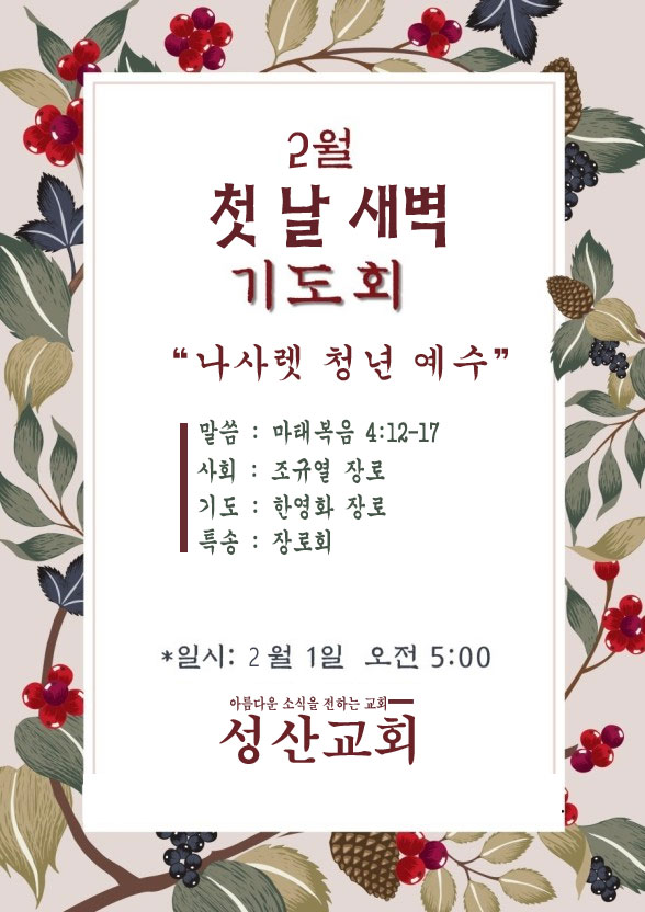 공지 | 2월 월삭 페이지 정보 작성자 최고관리자 작성일25-01-25 19:01 조회898회 댓글0건 관련링크 이전글 다음글 목록 글쓰기 본문 * SNS공유 댓글목록 등록된 댓글이 없습니다. 이전글 다음글 목록 글쓰기