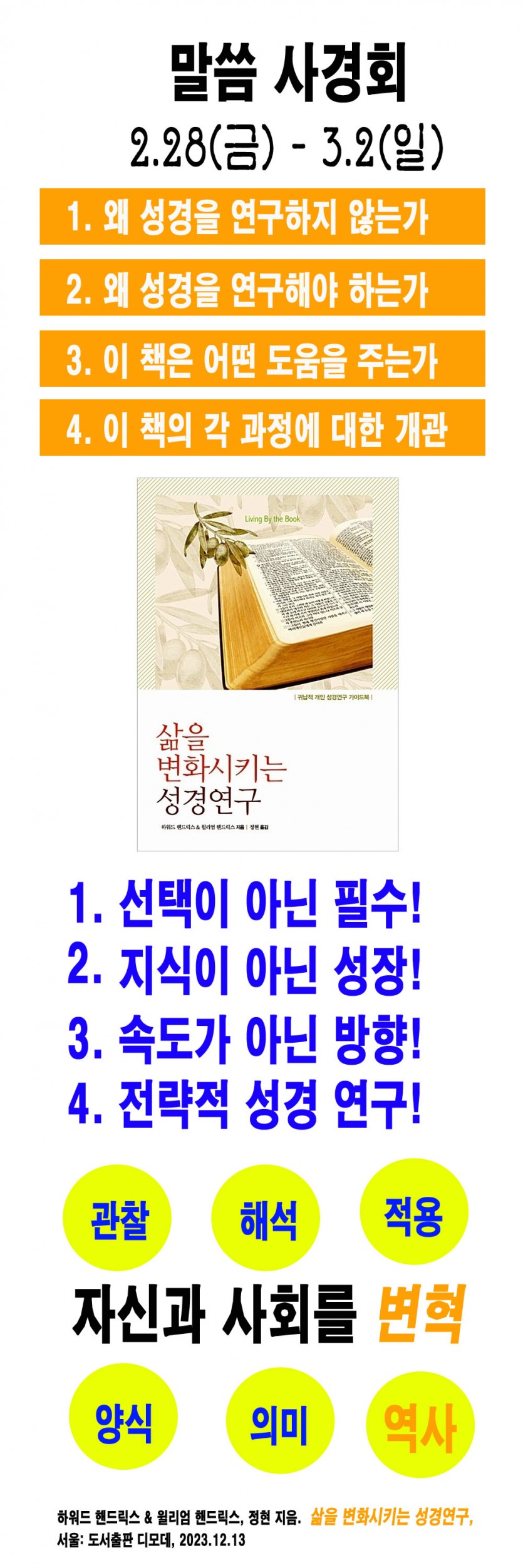 공지 | 말씀의 꽃(2.28) 페이지 정보 작성자 최고관리자 작성일25-02-28 01:42 조회684회 댓글0건 관련링크 이전글 다음글 목록 글쓰기 본문 오는 2.28일(금) 오후 7시부터 3.2(일) 주일 오후 3시까지 말씀의 꽃, 사경회를 실시합니다. 이번 사경회를 통하여 성경을 동역자로 삼고 자신과 사회를 변혁시키는 믿음의 명장이 되시기를 기도합니다. 오늘 저녁 7시에 뵙겠습니다. 오주현 목사 드림. SNS공유 댓글목록 등록된 댓글이 없습니다. 이전글 다음글 목록 글쓰기