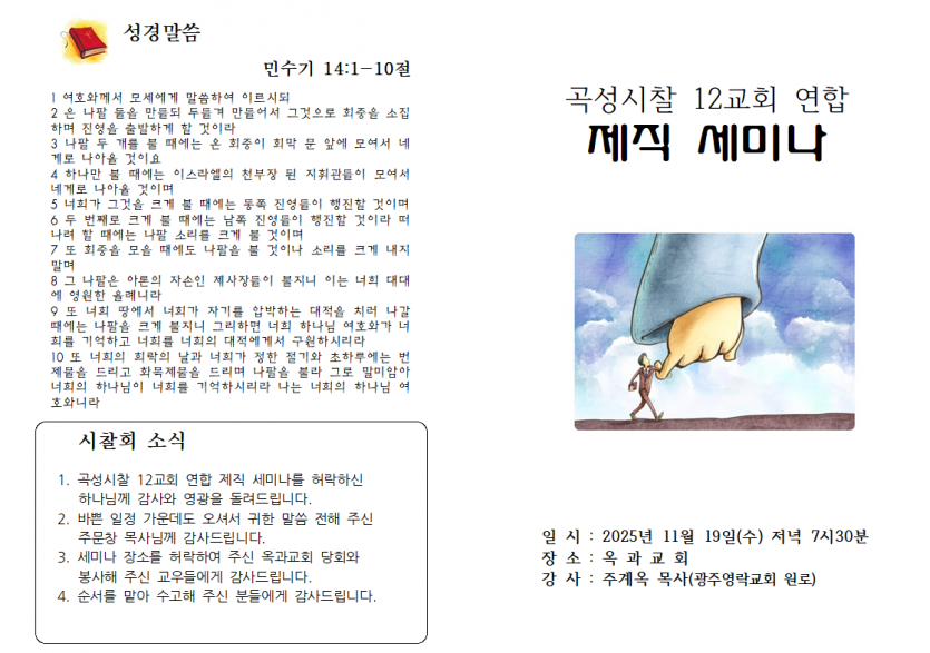 공지 | 11.20 제직 세미나 페이지 정보 작성자 최고관리자 작성일25-11-22 18:37 조회90회 댓글0건 관련링크 다음글 목록 글쓰기 본문 * SNS공유 댓글목록 등록된 댓글이 없습니다. 다음글 목록 글쓰기