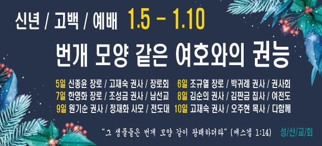 공지 | 신년 고백 예배 페이지 정보 작성자 최고관리자 작성일26-01-03 16:35 조회398회 댓글0건 관련링크 이전글 다음글 목록 글쓰기 본문 * SNS공유 댓글목록 등록된 댓글이 없습니다. 이전글 다음글 목록 글쓰기