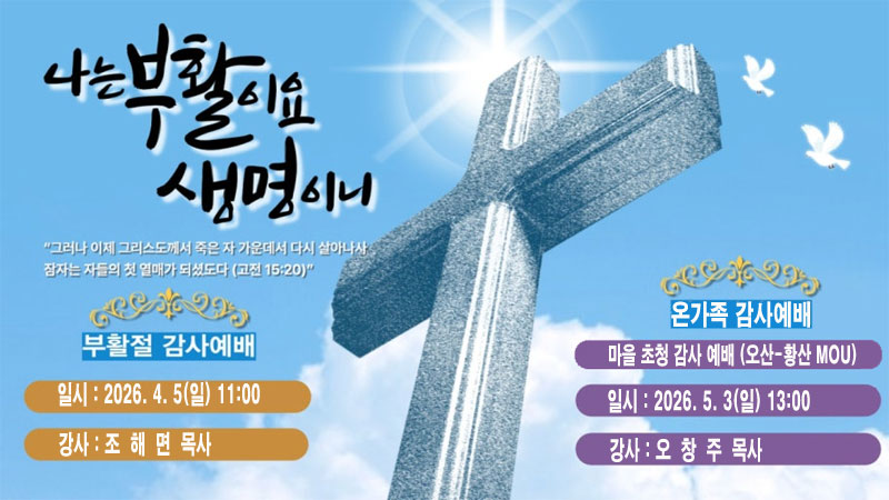 공지 | 부활절 감사예배 페이지 정보 작성자 최고관리자 작성일26-04-04 17:41 조회7회 댓글0건 관련링크 이전글 다음글 목록 글쓰기 본문 * SNS공유 댓글목록 등록된 댓글이 없습니다. 이전글 다음글 목록 글쓰기